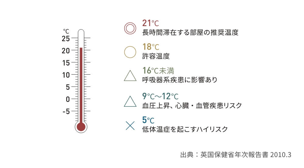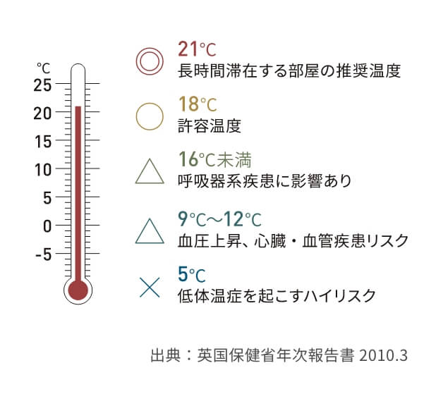 イギリスでは、健康に過ごせる室温を21℃として推奨しており、18℃までが許容できる室温だとしています。