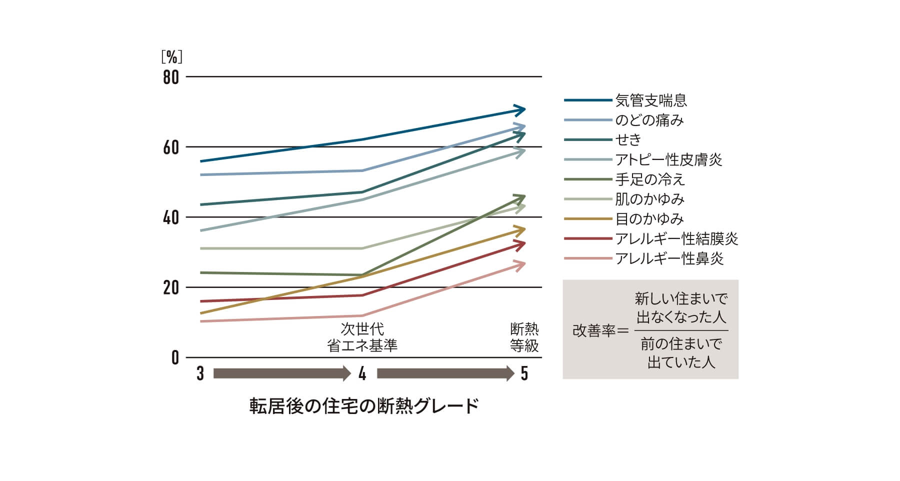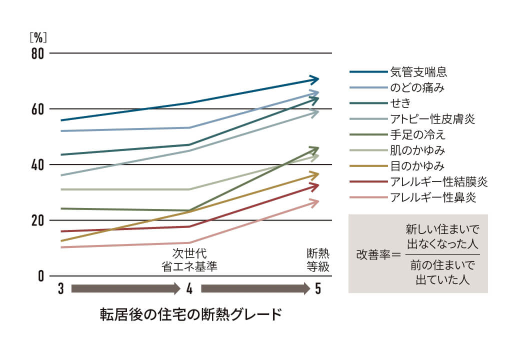 脳血管疾患や心疾患のように生死に関わることだけでなく、多くの世代の方が日常的に経験する軽い疾患も、断熱性能が良い家に引っ越すと症状が良くなる人の割合が増えていきます。また、断熱性能を高めて家を暖かくすることで、肌トラブルを防ぎ、血行も良くなったり、皮膚のかゆみや風邪、腰痛などの症状が軽減するという事例も多くあります。
