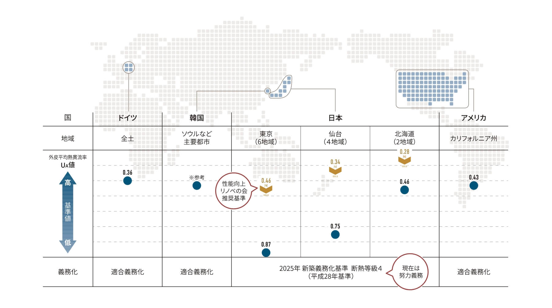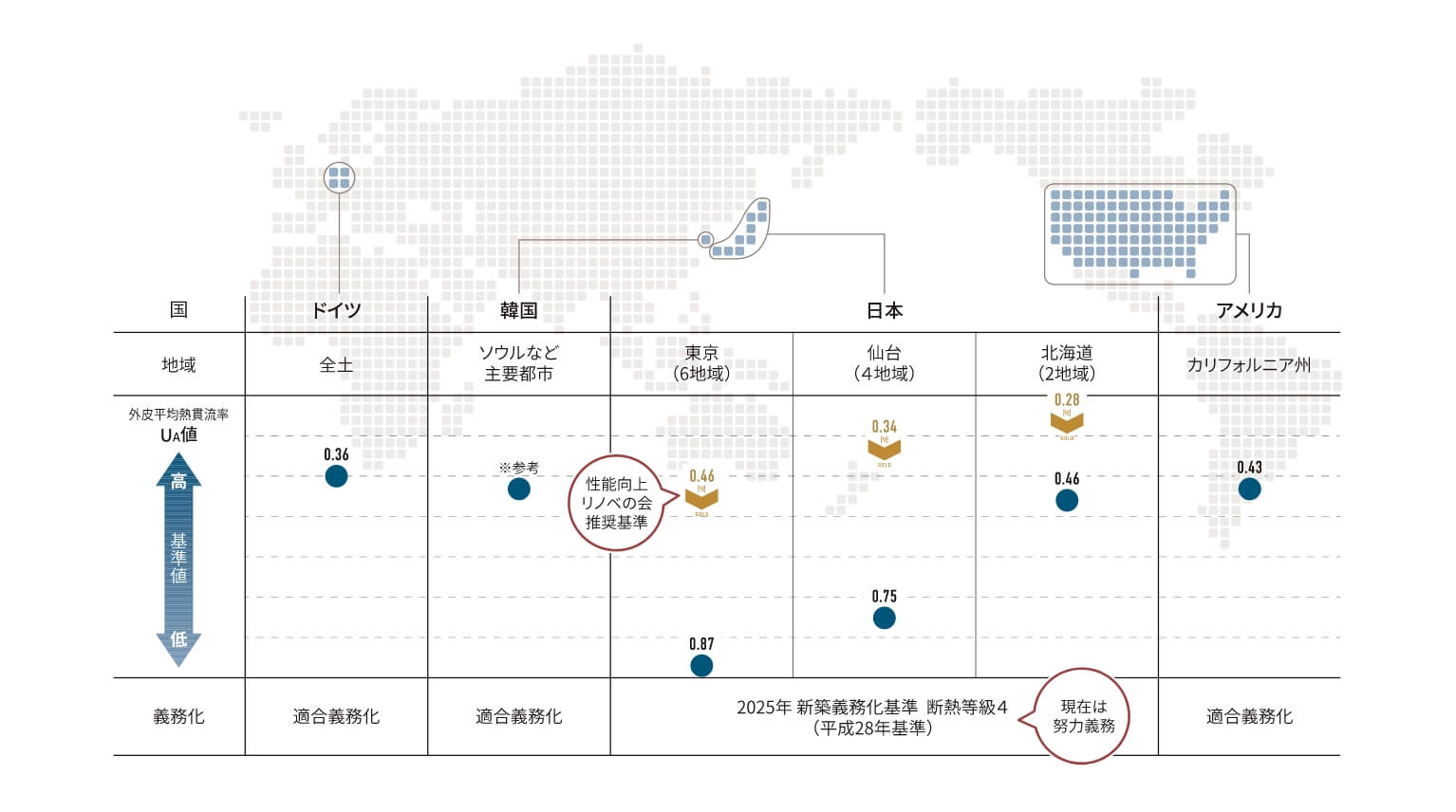 日本の2025年新築性能義務化基準と世界の適合化基準とでは、大きな格差があります。
