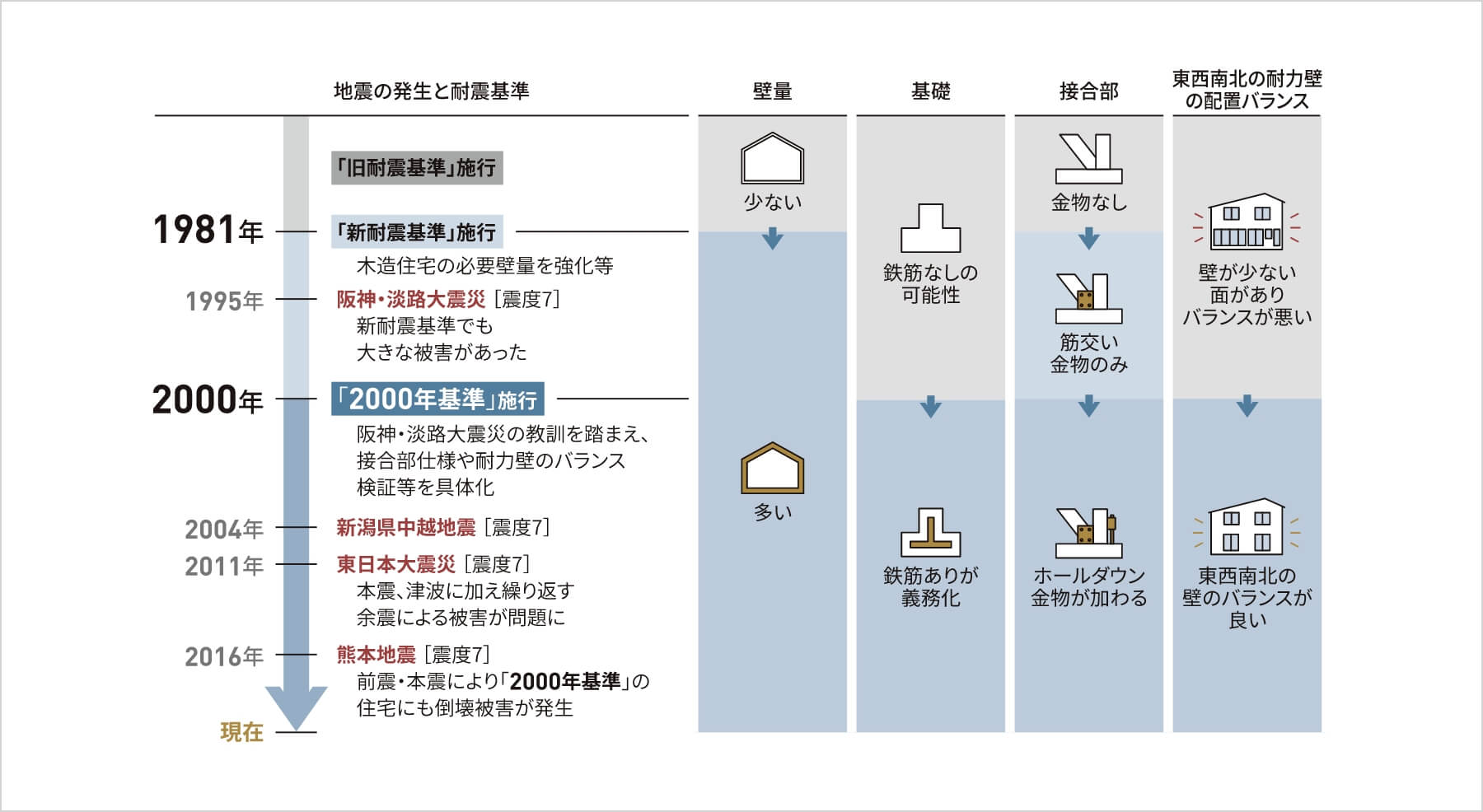 2000年基準は倒壊・崩壊の防止には有効ですが、1度耐えられることが前提で、その後の繰り返す地震までは想定されていませんでした。