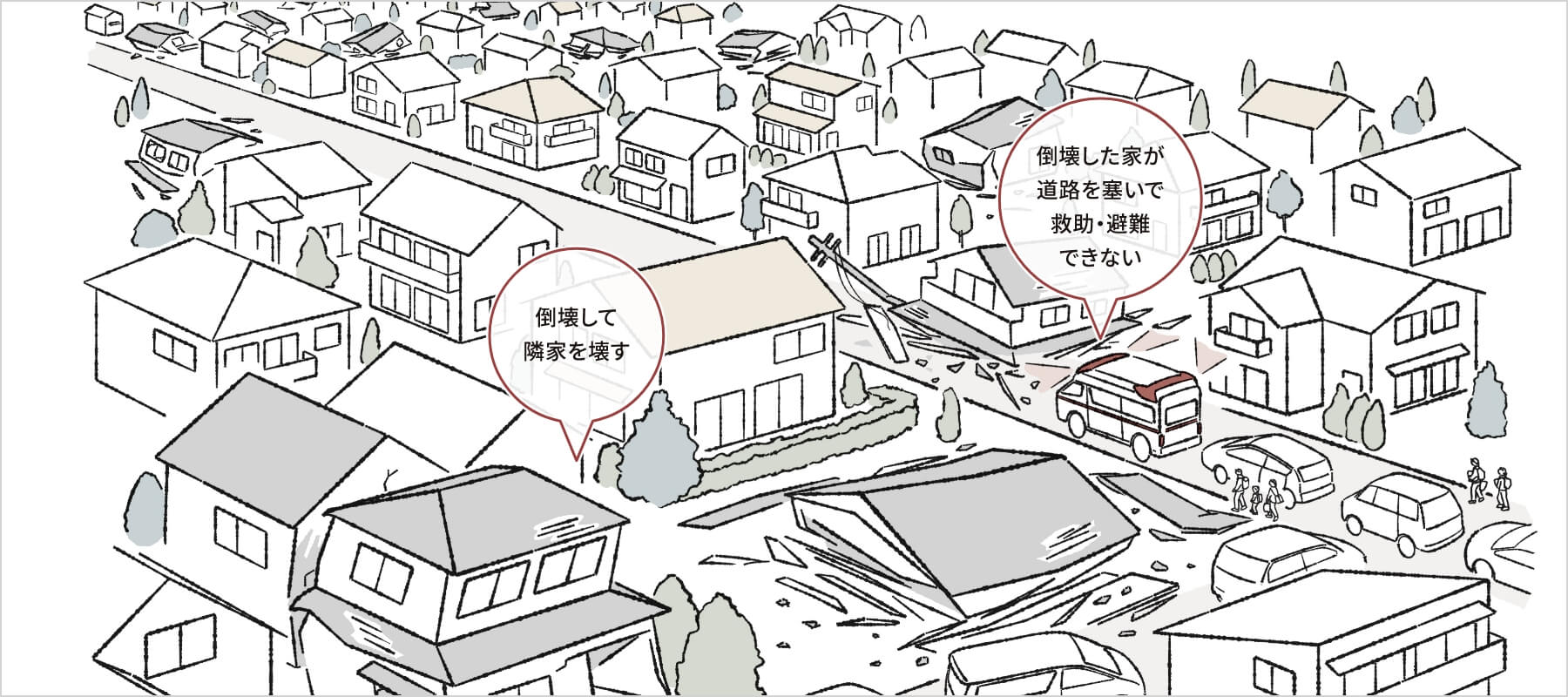 地震が起こると、耐震性能が低い住宅は道路を塞いだり、隣の家を押しつぶしたりします。津波から避難しようとしても通れず、救急車が助けに行こうとしても、道路が塞がって助けられない、ということが起こります。