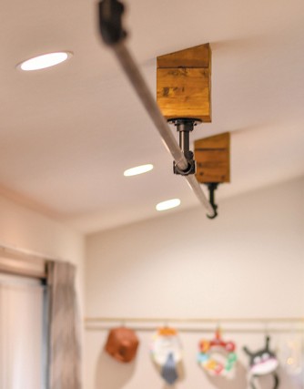 室内干しパイプやS字フックを取り付けておけば、雨の日で濡れたレインコートを干す場所に早変わり。小さい息子さんのいるご家庭らしい、住まいを便利にする観点が光ります。