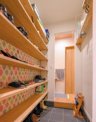 玄関脇には、室内に出入りできる動線を確保した土間収納を備えます。お客様は玄関から、家族の出入りは土間収納で、と使い分けることができます。 家族の靴をまとめて仕舞えるから、その日のコーディネイトに合わせた、靴選びもラク。