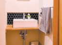 ブラックのヘキサゴンタイルがソフトな陰影を生み出し、シンプルで洗練された印象に仕上げます。