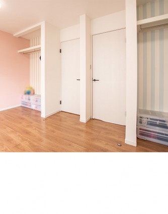 まだ2人が幼いうちは、あえて仕切らず1部屋で一緒に遊べます。今後のことを踏まえ、先にドアを2つ設置しました。いずれ部屋を間仕切りして、2部屋にすることもできるよう考慮しています。