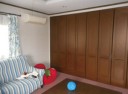 この部屋のフローリングのみ、部屋のイメージに合わせて、少しピンクがかった木目柄を選びました。キズに強く、汚れが付きにくい素材で、ダニの死がいや花粉などのアレル物質を抑制する塗装で仕上げました。娘さんたちが安心して、のびのびと過ごせます。