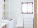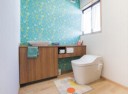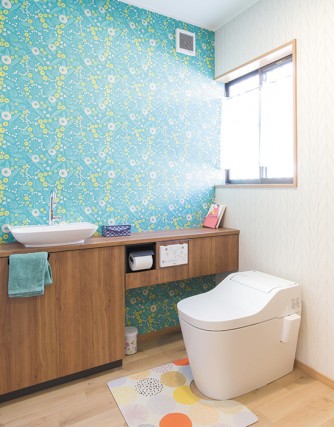 壁1面に家具のような収納用カウンターを設置して、トイレットペーパーや掃除用品などを仕舞って、スッキリ見せます。トイレがまるでお部屋のように、過ごしやすい空間となりました。いずれ必要となるお子様のトイレトレーニングにも、じっくりと付き合えます。