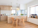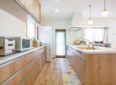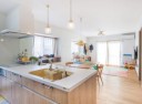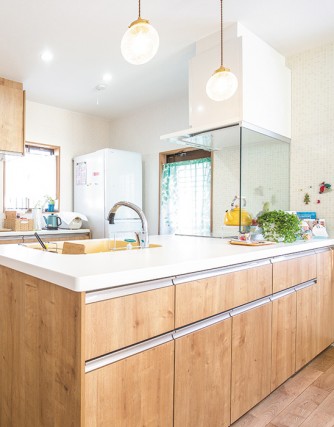 LDKに馴染む木目(ライトグレイン)柄キッチンは、リクシルのアレスタ。 ホワイトのレンジフードやIHコンロ前にガラスパネルを設置できること、ダイニング側に収納があることといった、奥様のご要望をしっかり実現します。