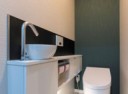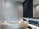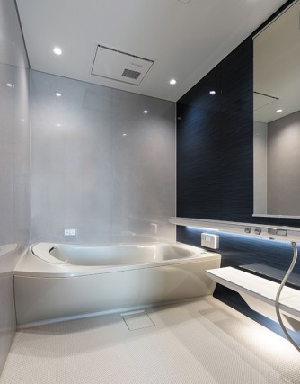 浴室は、TOTOのシンラを採用しました。ラメールブルーのアクセントパネル、調光調色できる照明でお好みの明るさに調整でき、ラグジュアリーな空間を演出。