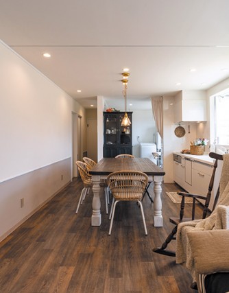フクロウさんとの共同生活を快適にするために、床材は複層ビニル床シートを選ばれました。 耐久性と清掃性が高く、ラスティックな木目や色合いがリアルです。