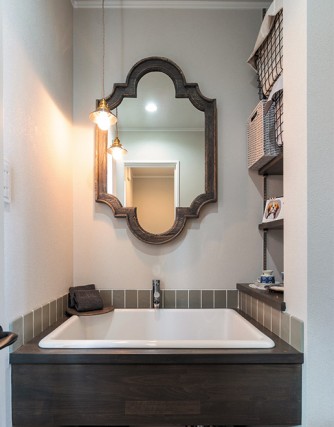 タイルは、名古屋モザイクのアラベスコを1列だけあしらって。 水ハネを防止しつつ、洗面廻りをさりげなく印象的に魅せる効果があります。