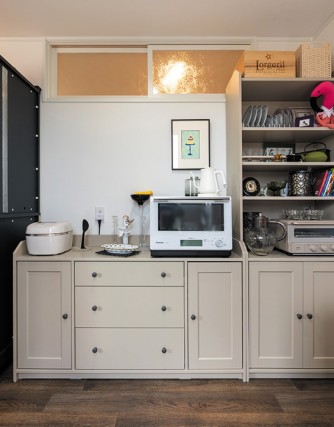 モノトーンの中に色を入れるのがN様流で、食器や小物の中に混ざる、本やぬいぐるみの色が良いアクセントになっています。