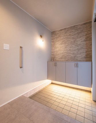 中に入ると、やわらかなグレイッシュカラーの玄関が広がります。天井と壁にグレーの塗り壁調クロス。壁面のアクセントクロスは、石英を表現した積石タイル柄を貼りました。