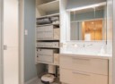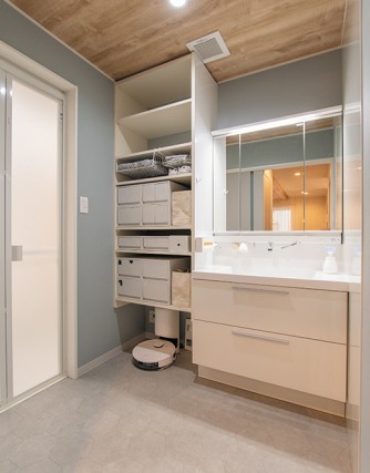 洗面化粧台のキャビネットやミラー収納のほか、洗面化粧台の横に、たくさん収納できて機能的なラクエル(南海プライウッド)を取り付けました。