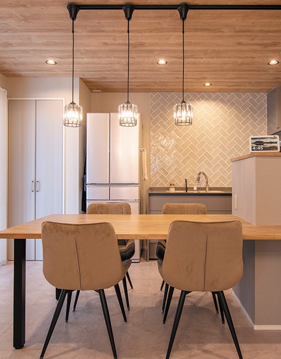 家電収納をまとめて置けるカップボードは、自動で蒸気を排出する機能付き。このカップボードを腰壁で覆い、キッチンの作業中でもリビングからの視線を隠せます。ダイニングテーブルと隣接しており、食事のセッティングや家電が使いやすくスムーズになりました。