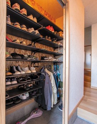 Y様ご夫妻から「玄関に、少しだけでも収納が欲しい」という要望をいただきました。以前はオープンの玄関収納で丸見えだったこともあり、引戸で仕切って自由に開閉できる土間収納を設けました。