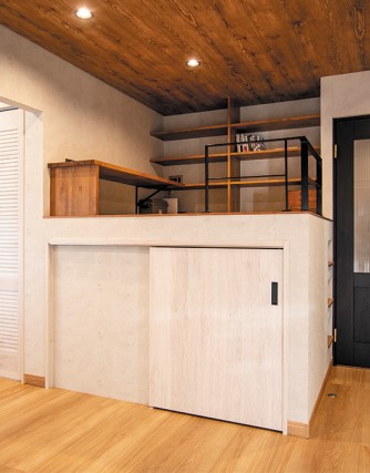 リビング内に、ロフト。お子様のスタディースペースとして使えるよう、デスクカウンターや本棚を造作しました。LDK内にいるご家族の存在を感じながらも目線の高さが変わるのが新鮮で、H君(1番上のお兄ちゃん)のお気に入りの場所です。