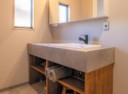 洗面台は、指紋が目立ちにくい化粧板を使った造作です。