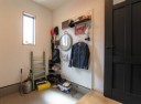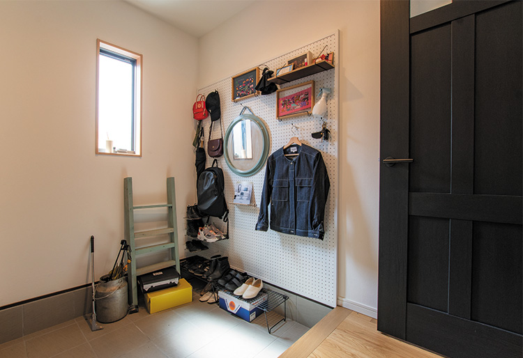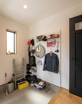 玄関収納は置かず、土間の幅に合わせて壁面に有孔ボードを設置しました。