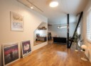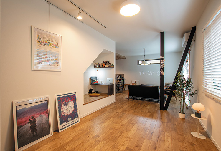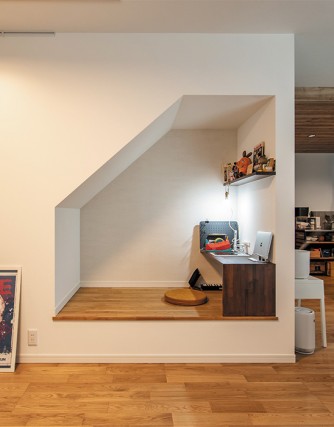 階段下スペースは、小上がりのヌックに。ワークスペースを想定して、壁面の大きさに合わせてデスクカウンターを造作しました。パソコンや書き物をするときにも、この籠る感じが集中できるそうで、自宅でのお仕事も捗ります。