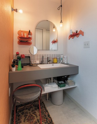 アイカの洗面台は、継ぎ目のないスタイリッシュカウンター。オープン棚には、メイク用品やティッシュなどを置いて、すぐに取り出しやすいようにしました。