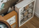 小物を飾れる小さな棚、海外で見つけた刺繍を額に入れて飾りました。