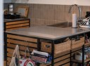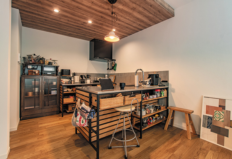黒の鉄 × 木製スリットの意匠性があるフレームキッチン(ウッドワン)は、省スペースに使えるⅡ型をご提案。