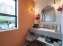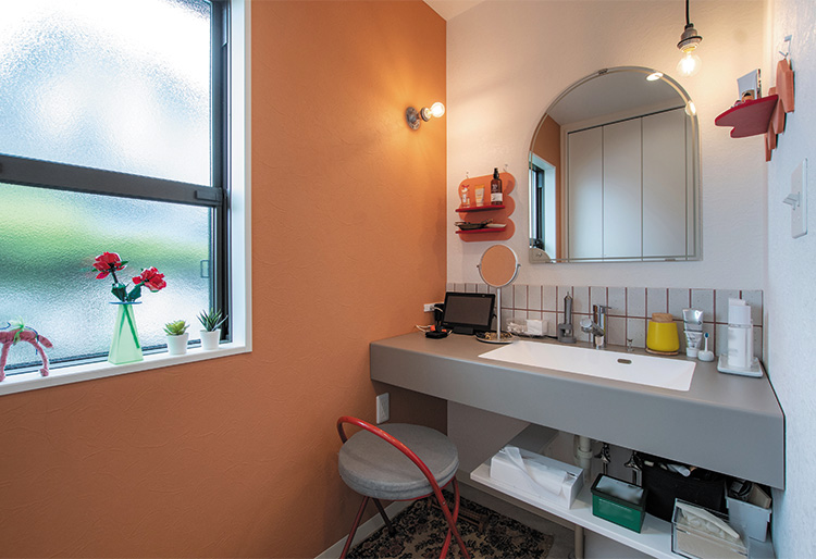 アール壁の中は、モロッコのマラケシュピンクをイメージした2.2帖の洗面コーナー。
