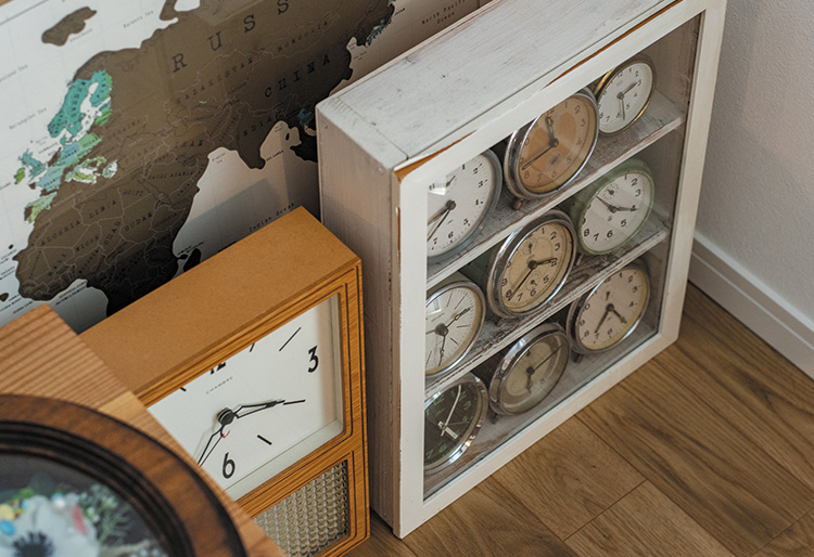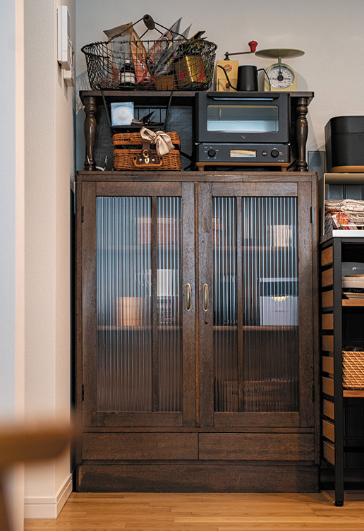 キッチン収納はオープン棚を中心に、自由に収納できるようにしました。キッチン側は食器やカップ、食品、ストック品など日常的に使うものを。リビング側から見える場所には、食器やフィギュアなどをディスプレイ。