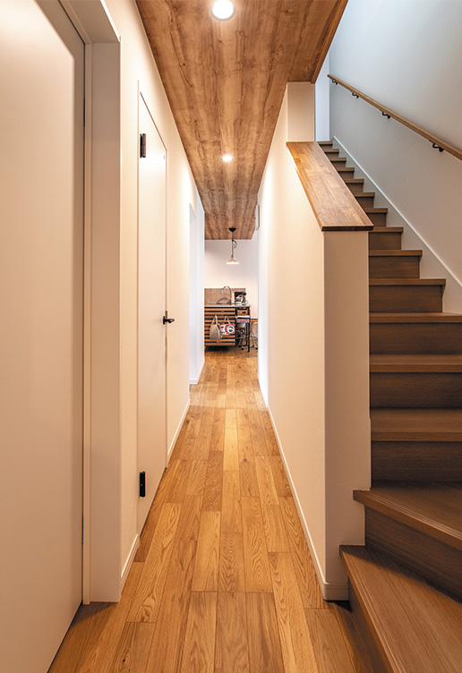 廊下~キッチンは下がり天井にして、LDK内に変化を持たせました。
