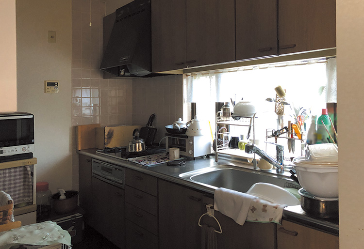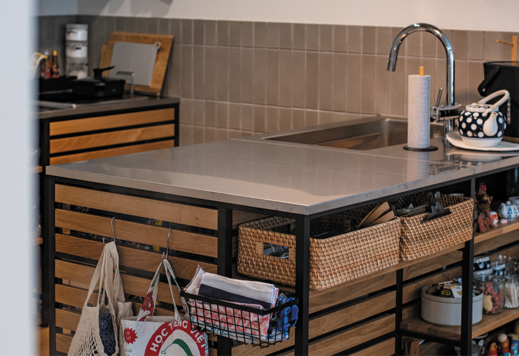 ユニットを組み合わせてアレンジすることが可能で、シンク横カウンターの対面側の棚板を外して、日常的に軽く食事をするスペースを設けました。