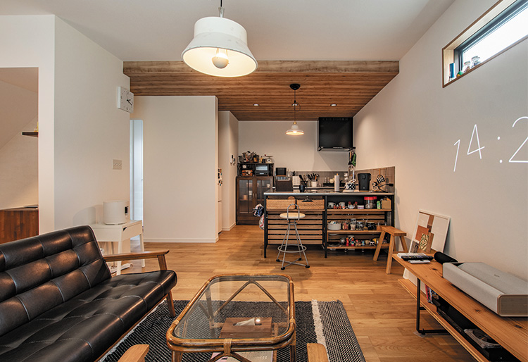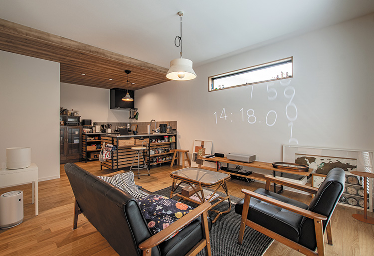 リビングにはテレビを置かず、プロジェクターを投影できるようにプレーンな壁紙を貼りました。キッチン側からも、映像が鮮明に見えます。