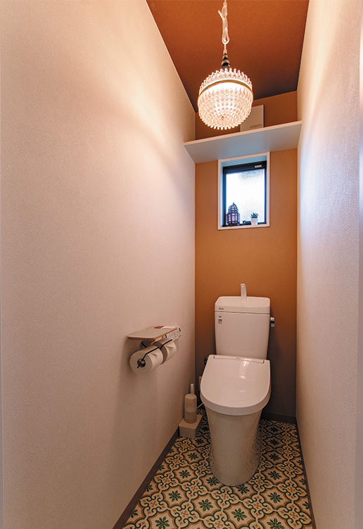 壁面には、ホワイトのクラフトタイルに梅色の目地材。アクセントクロスとリンクする色で、タイルの存在を引き立てます。
