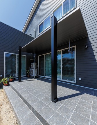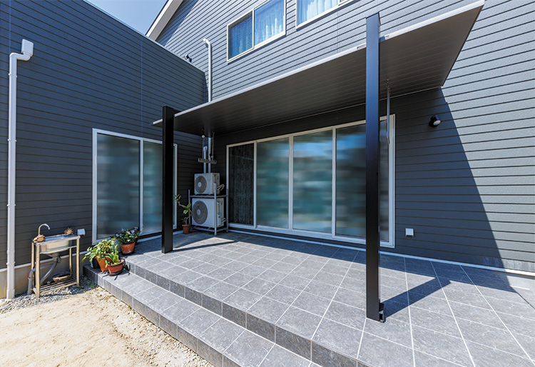 LDKから外に出ると、広い庇のあるタイルデッキが。直射日光や雨を避けながら、洗濯物を外干しすることができます。