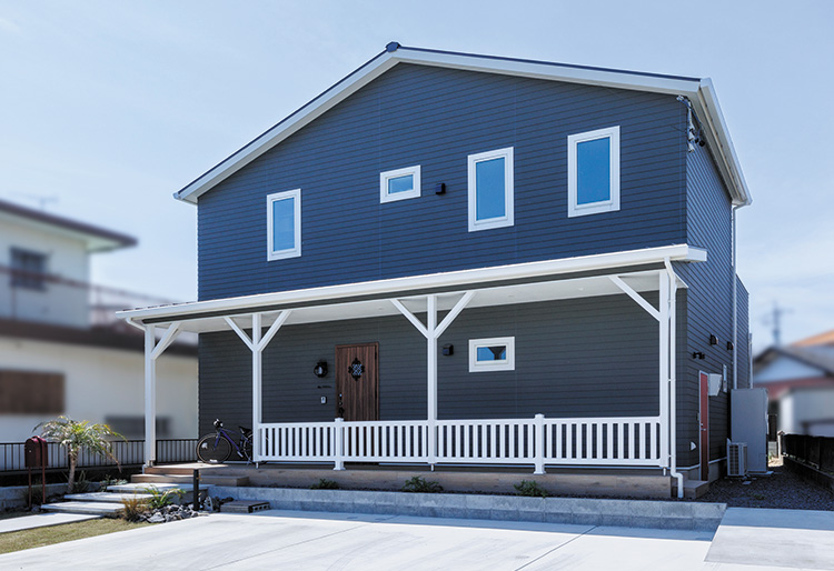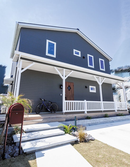 三角屋根にカバードポーチ、アーリーアメリカンスタイルに仕上げた外観に目を惹かれます。