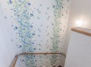 アクセントクロスは、縦空間を活かしたハチドリが飛び回る柄。柔らかい色合いや視覚的にも楽しく、ほっこりと和みます。