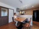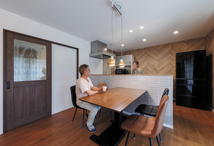 LDK内で目を惹かれるのは、キッチン壁面のフレンチヘリンボーン柄のアクセントクロス。