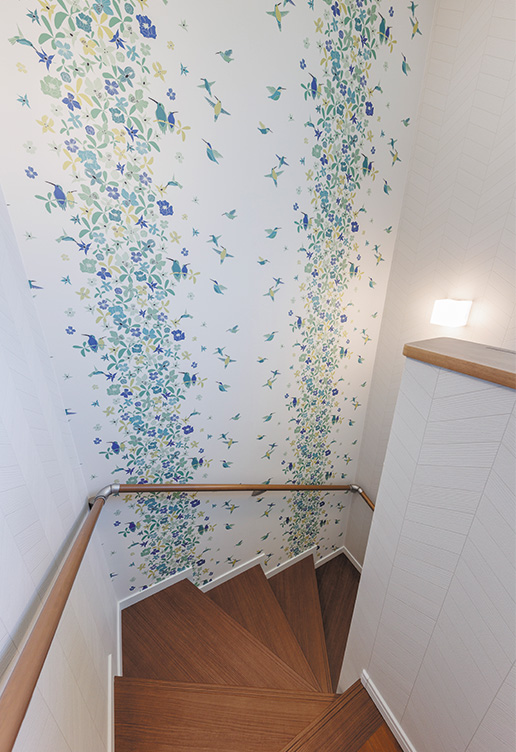 システム階段は、床材にマッチするチェリー柄。