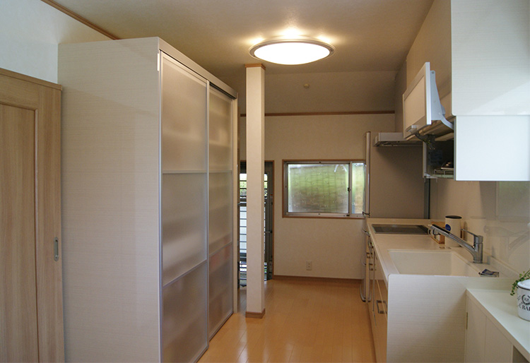 キッチンに立つと、廊下へと繋がるステンドグラス調の引き戸が視界に入ります。