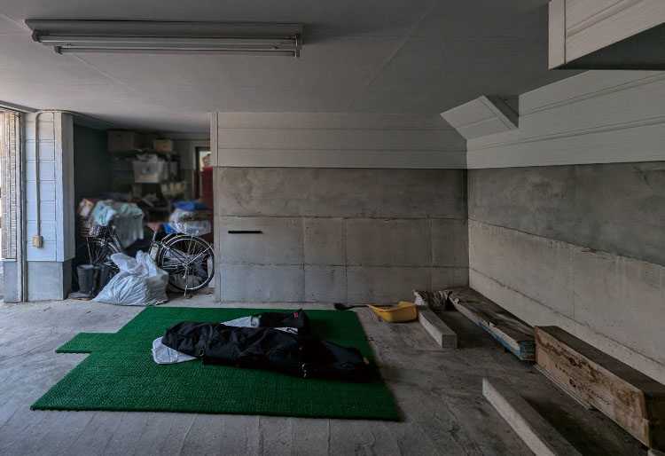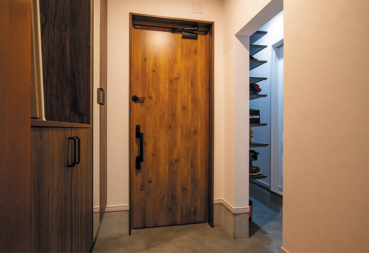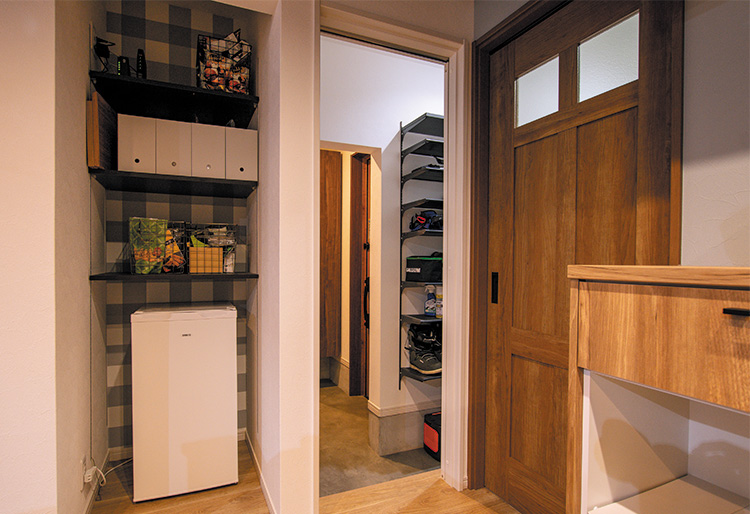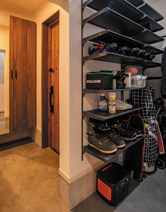 旦那様がメインで使うバックヤードと隣接しており、スポーツグッズを運び出すことも考えて、あえて扉レスに。スポーツ用の靴やグッズを置くための棚は、モノの高さに合わせて変えることができ、樹脂製の棚を外して水洗いすることも容易です。
