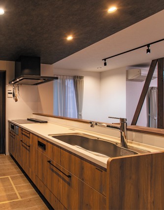 木製キッチンは、タカラスタンダードのリフィットをセレクト。キッチンの間口に1cm刻みで対応でき、作業しやすい広さに収めました。人造大理石のワークトップは、シャインベージュ。家具のようなヒッコリーミディアムの扉色に、ブラックの取っ手を合わせました。
