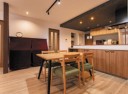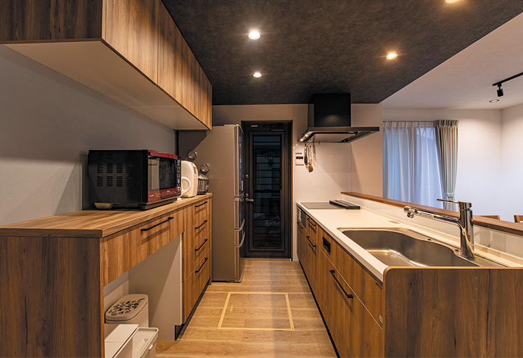 下がり天井でメリハリを効かせたダイニングキッチン。