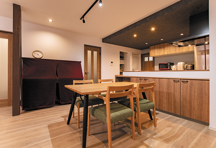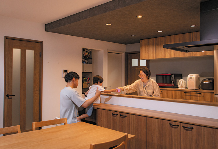 ゆっくり座って食事ができる場所にダイニングテーブルを配置しました。キッチンカウンターやカップボードに料理を置けば、配膳や片付けもスムーズです。