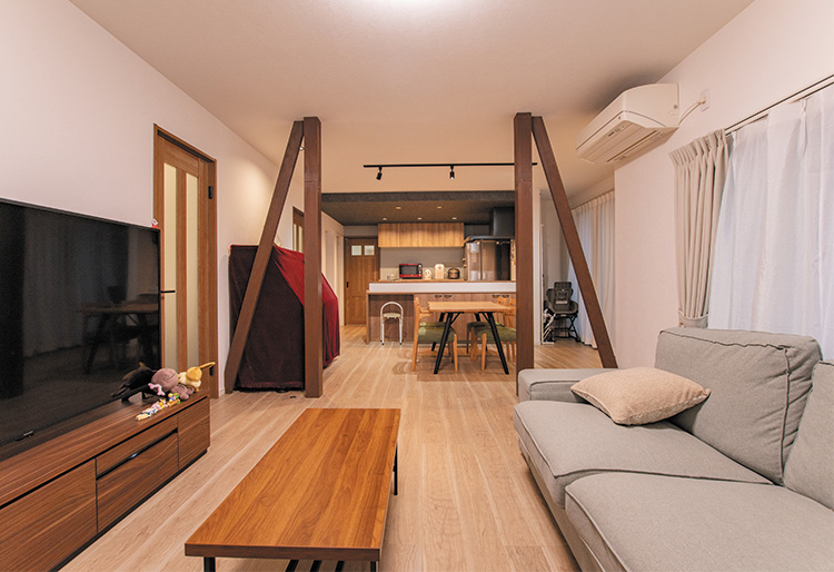 建物の構造上、必要な柱は残して、ドア色と合うウォールナット色で塗装しました。