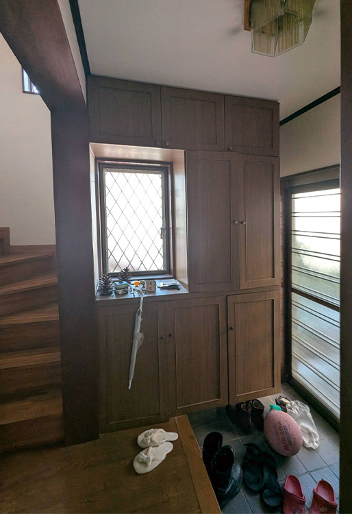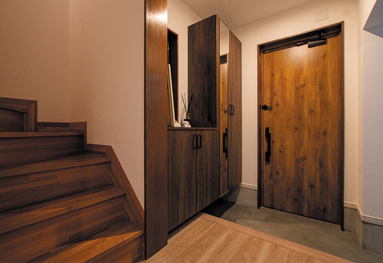 玄関に隣接したシューズクロークは、フロートタイプのコンポリア(Panasonic)。ミラー付きで、お出かけ前の全身チェックが可能。高さの違う玄関収納を組み合わせて、ディスプレイスペースを設けました。小物やディフューザーを置いて、家族やお客様をお出迎えします。