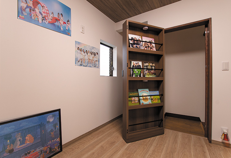 6.5帖の広さで、壁面には応援しているグループのポスター。オープンラックには、推しのグッズやフィギュア、漫画などを並べて。